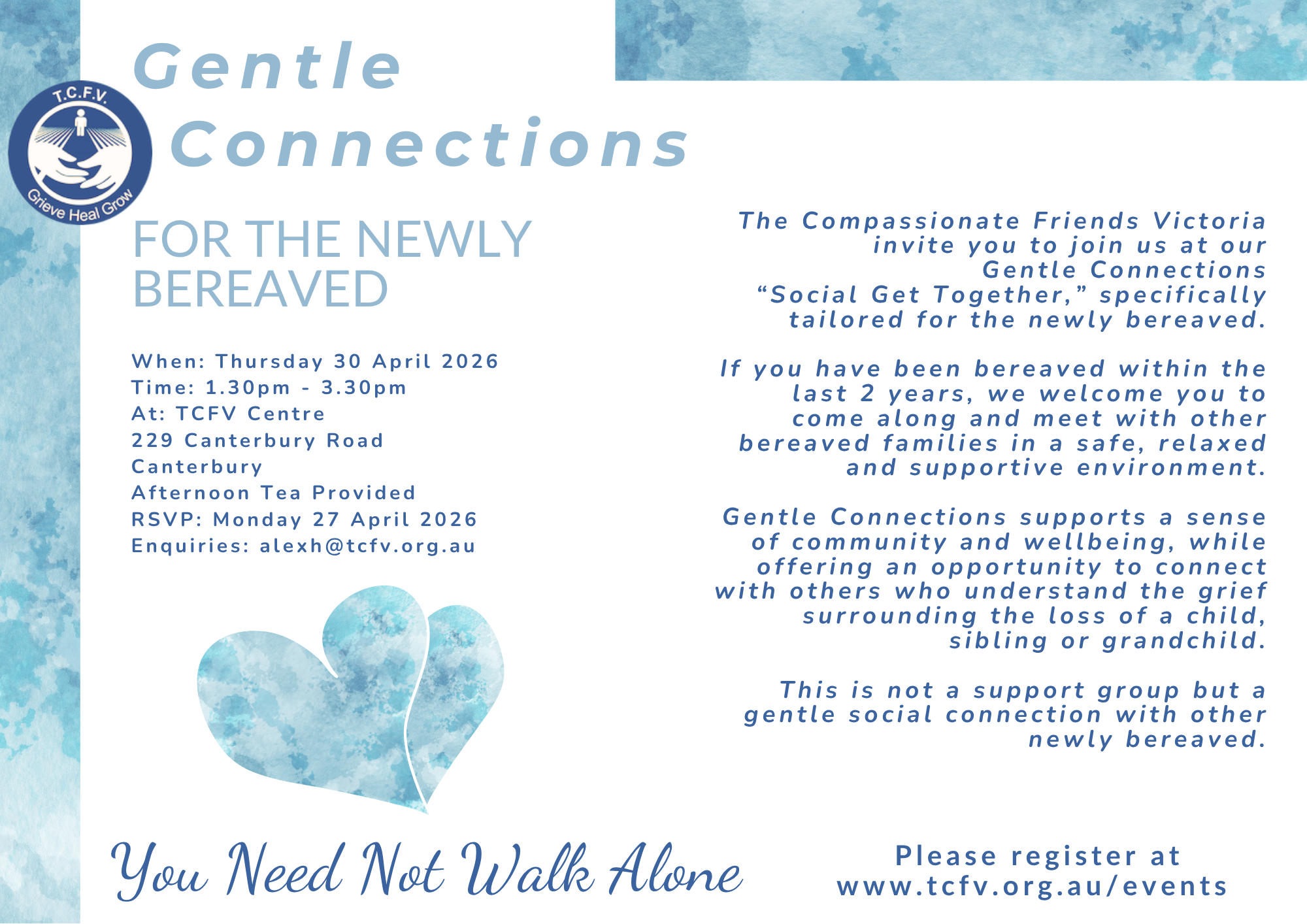 The Compassionate Friends Victoria 229 Canterbury Road, Canterbury, Victoria, AustraliaThe Compassionate Friends Victoria invite you to join us at our Gentle Connections “Social Get Together,” specifically tailored for the newly bereaved. If you have been bereaved within the last 2 years, we welcome you to come along and meet with other bereaved families in a safe, relaxed andsupportive environment. Gentle Connections supports a sense of community and wellbeing,... Read more »