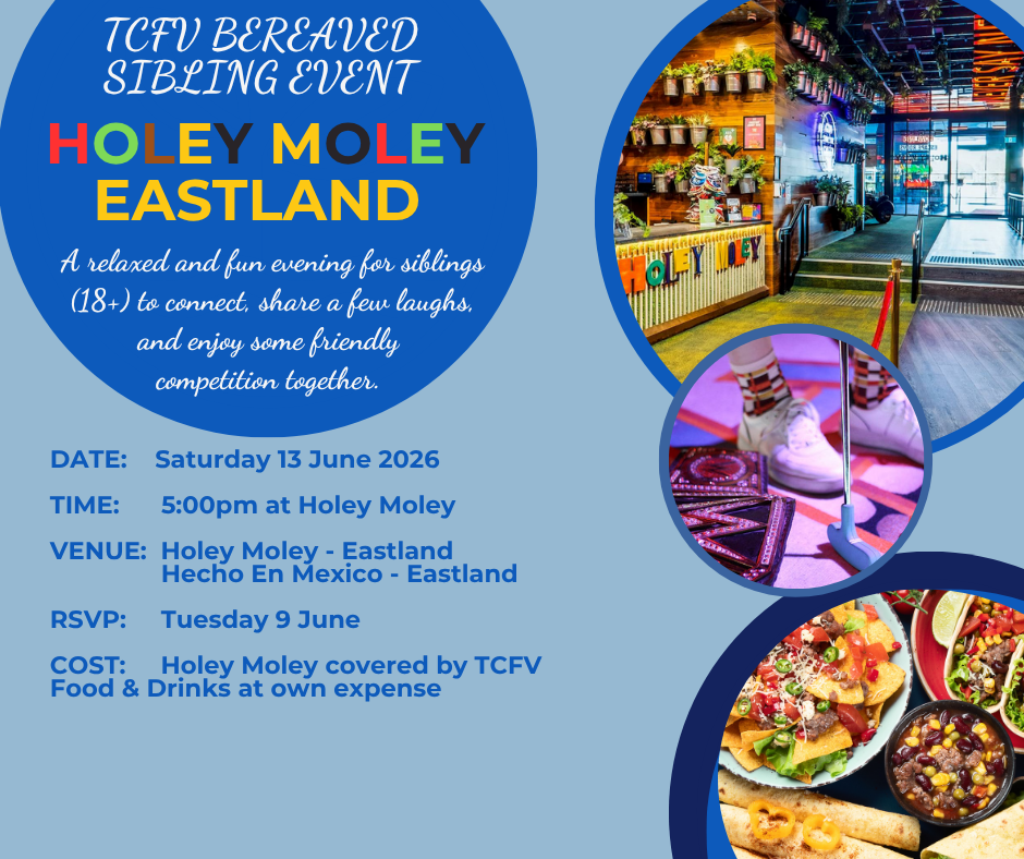 Holey Moley Eastland 171-175 Maroondah Hwy, Ringwood, VIC, AustraliaTCFV SIBLING EVENT Please join us on Saturday 13 June, for a relaxed and fun evening with other bereaved siblings (18+) to connect, share a few laughs, and enjoy some friendly competition together at Holey Moley, followed by dinner afterwards at Hecho En Mexico. You are welcome to join us for both golf and dinner... Read more »